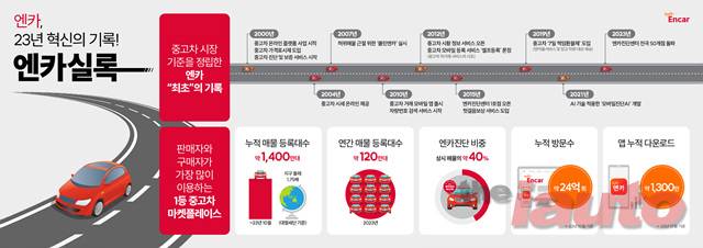 국내 최대 자동차 거래 플랫폼 엔카닷컴(대표 김상범)이 오는 8일(금) 창립 23주년을 맞아 중고차 시장에서 도전과 혁신을 만들어 온 최초의 기록을 담은 인포그래픽 엔카실록을 공개했다. 인포그래픽에서는 국내 대표 중고차 플랫폼으로 성장하기까지 엔카의 업계 최초의 도전과 그 성과를 담아냈다.