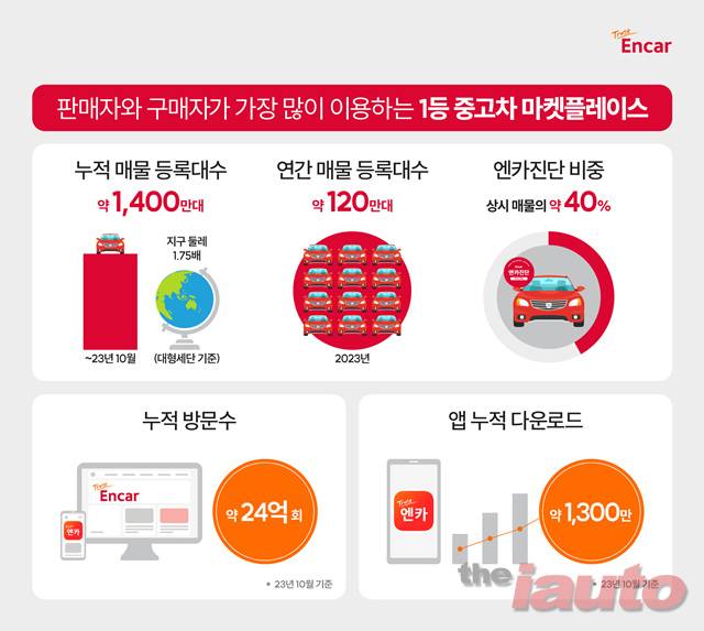 다양한 매물 선택지와 압도적인 브랜드 파워로 누적 방문수도 업계 최대 규모를 기록하고 있다. 지금까지 엔카닷컴을 찾은 누적 방문수는 약 24억회, 앱 다운로드는 약 1,300만을 넘어섰다.