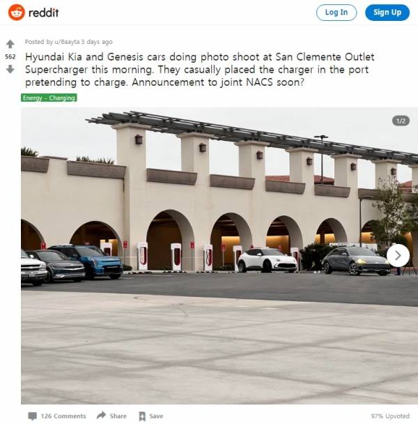 현대자동차그룹의 전기차가 미국 캘리포니아의 한 슈퍼차저 스테이션에서 충전 중인 모습이 포착됐다. 포착된 차량은 현대 아이오닉 5, 아이오닉 6, 기아 EV9, 제네시스 GV60이다. 이에 따라 현대차그룹이 테슬라 전용 충전 커넥터 ‘NACS(북미 충전 표준, North American Charging Standard)’를 채택이 임박했다는 추측이 나오고 있다.