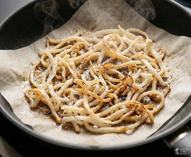 프라이팬을 사용할 경우, 깊은 웍에 종이호일을 깔고 약불에서 4~5분 굽는다. 뚜껑을 덮어 수분이 날아가지 않도록 유지한다. 중간에 한 번 뒤집어 색을 고르게 맞추면 완성이다. 완성 직후에는 표면이 부드럽게 느껴지지만, 한 김 식으면 점차 탄력이 올라가면서 쫀득한 질감으로 변한다. 마무리에 파슬리를 소량 흩뿌리면, 색감이 다양해져 한층 먹음직스럽게 보인다.