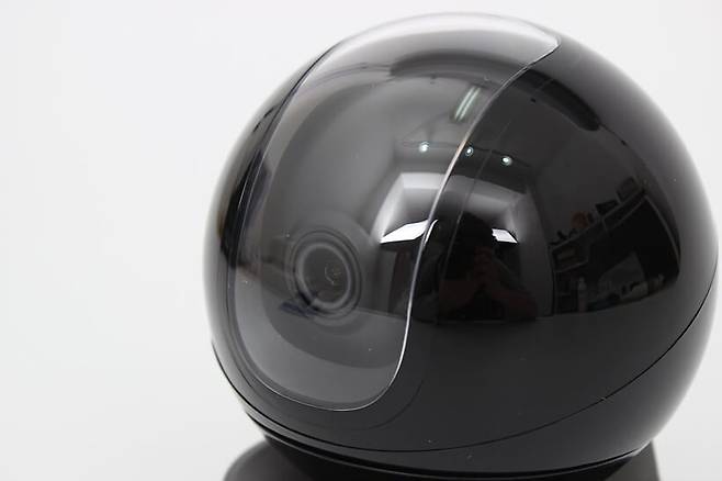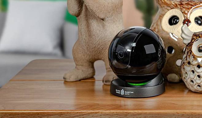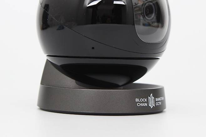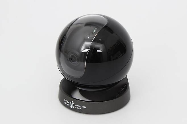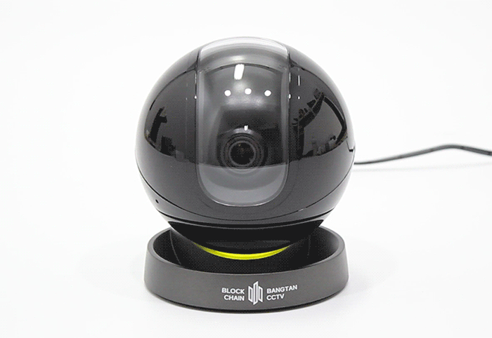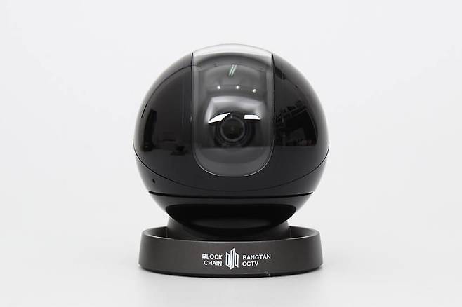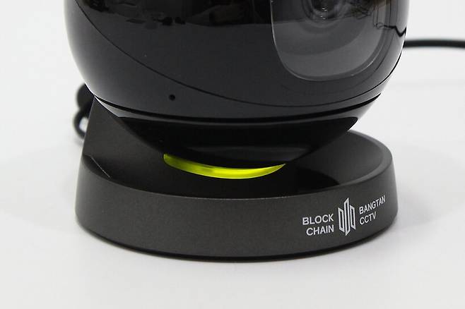 정면에서 바라보면 구체 중심부에 카메라 렌즈가 위치해 있고, 아래쪽 받침대에는 BLOCK CHAIN BANGTAN CCTV라는 브랜드명이 인쇄되어 있다.