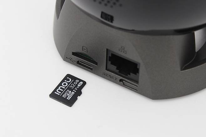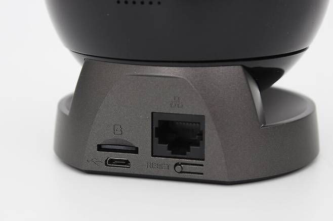 자세히 살펴보면 RJ45 이더넷 포트와 마이크로SD 슬롯, USB B타입 포트 및 리셋 버튼이 위치해 있는 것을 확인할 수 있다. 방탄 홈CCTV 3000은 와이파이를 지원하지만, 유선 인터넷 연결도 가능함을 알 수 있다. USB B타입 포트는 전원 입력용 포트이다.