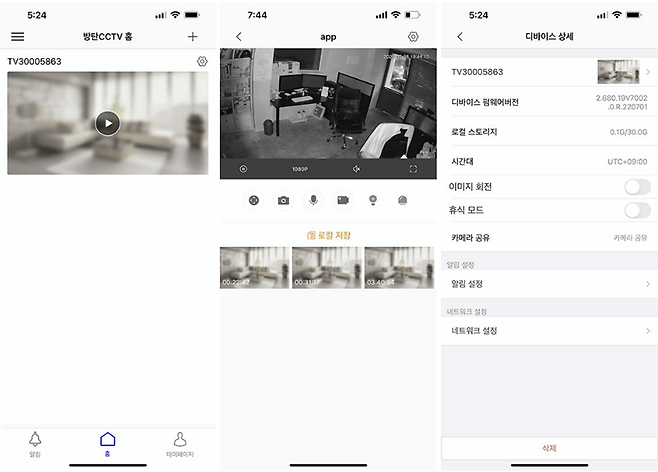 기기가 등록되면 홈 화면에 등록된 기기 수만큼 확인창이 표시된다. 확인창의 재생 버튼을 누르고 들어가면 실시간 화면이 나타나고, 그 아래 카메라 회전, 사진 촬영, 음성 전달, 동영상 촬영, 조명, 경보음 등의 버튼이 보인다. 화면 위쪽의 톱니 모양을 누르면 디바이스 상세 페이지로 진입하는데, 카메라 이름이나 펌웨어, 로컬 스토리지 상태 등을 확인할 수 있다. 또한 천장에 본체를 뒤집어서 설치한 경우 영상의 상하를 뒤바꾸는 이미지 회전 기능과 카메라를 아래로 돌려서 촬영을 중단하는 휴식 모드를 선택할 수도 있다.