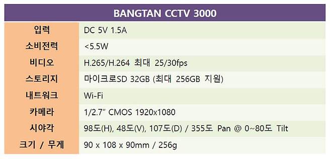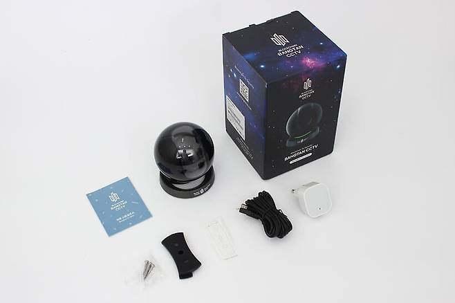 방탄 홈CCTV 3000은 박스에 우주를 배경으로 제품 외형이 컬러로 인쇄되어 있다. 박스 측면에는 제품의 특징을 아이콘 형태로 표시해 한눈에 쉽게 이해할 수 있다.