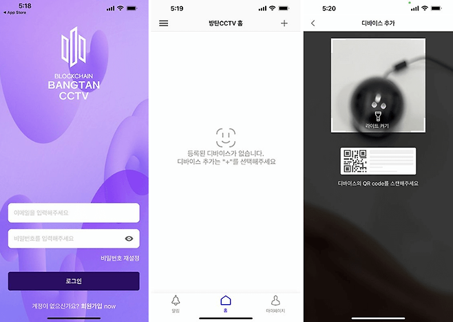 전원 연결이 완료되었으면 이제 스마트폰과 연동할 차례다. 스마트폰에 방탄CCTV 앱을 설치해서 계정을 생성한 후 + 버튼을 눌러서 기기를 등록해야 하는데, 본체 바닥 면에 있는 QR코드를 스캔해주면 된다.