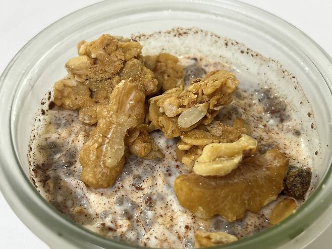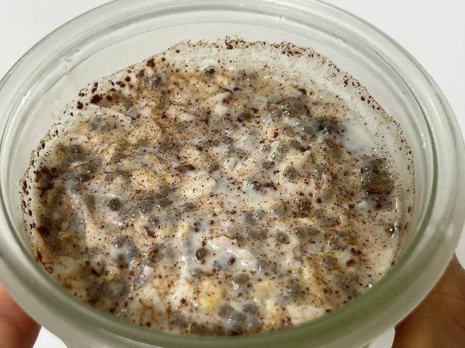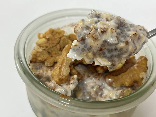 다음날 냉장고에서 꺼냈더니 수분은 재료들이 수분을 머금어 촉촉하게 부풀었습니다. 오버나이트오트밀이 충분히 부드러워 아침에 먹기에도 부담이 없고 속이 예민한 분들도 편안하게 먹을 수 있습니다.