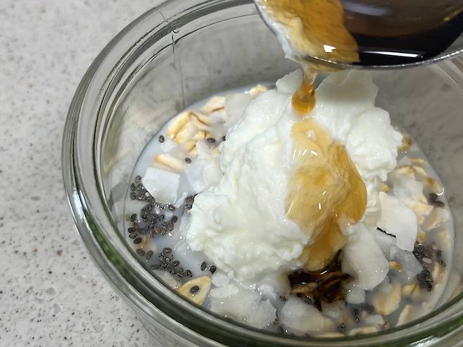 저는 코코넛 칩도 약간 넣었습니다. 코코넛칩은 생략하셔도 돼요. 오트밀, 치아씨드는 모두 그냥 먹으면 딱딱하기 때문에 우유, 두유 또는 아몬드 우유 등을 넣어서 불려야 합니다. 취향에 맞게 음료를 넣으세요. 재료가 모두 잠길 정도로 양을 넣습니다.