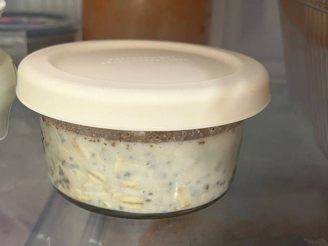 잘 저은 오트밀은 뚜껑을 닫고 냉장고에서 최소 반나절~ 하룻밤 불리세요. 그래야 충분히 수분을 머금어 재료들이 부드럽게 됩니다.