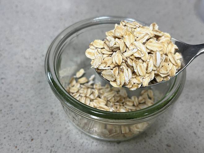 작은 사이즈의 용기를 준비한 다음 오트밀 3 스푼 넣습니다. 오트밀도 종류가 여러 가지인데요. 저는 롤드 오트를 추천합니다. 통귀리를 쪄서 납작하게 만든 것으로 조리 시간이 짧고 부드러운 편입니다.