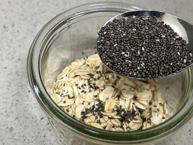 치아씨드도 1스푼 넣습니다. 치아씨드는 오메가-3와 식이섬유가 풍부합니다. 동시에 식물성 단백질원이면서 필수 아미노산까지 포함되어 있어 근육 유지와 회복에 도움을 줍니다.