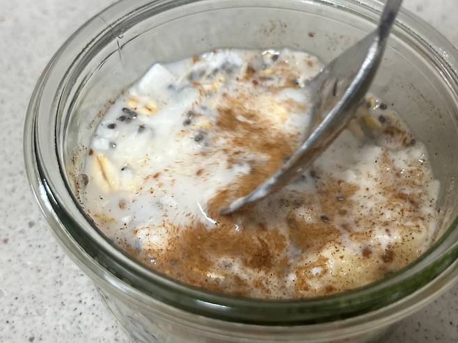 시나몬 파우더를 추가하면 풍미가 더욱 좋아집니다. 시나몬 파우더 대신 카카오 파우더, 바닐라 파우더 등을 넣으셔도 됩니다. 재료가 없다면 생략하셔도 아무 지장 없습니다.