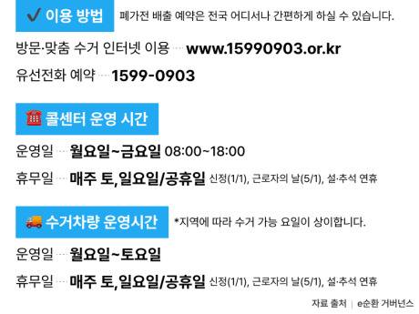 e-순환거버넌스 홈페이지 또는 전화번호 1599-0903 콜센터를 통해 배출 예약을 진행하시면 됩니다.