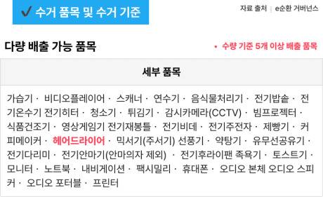 헤어드라이어는 수량 기준 5개 이상 배출 품목에 해당하여, 소형가전 5개를 모으거나, 다른 대형 가전 수거를 요청할 때 함께 수거해 달라고 접수해야 합니다.