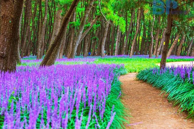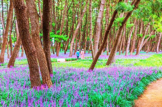 시원하게 부서지는 파도와 보랏빛 맥문동, 울창한 소나무숲의 풍경이 한데 모여 어우러져 환상적인 풍경을 자아낸다.