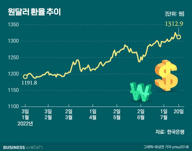 반도체·자동차 등 주요 수출기업의 지난 2분기 실적을 보면, '환율 효과'가 눈에 띈다. 달러 대비 원화 환율이 1300원을 넘기는 달러 강세가 지속되면서 실적이 개선된 것이다. 지난 2분기 달러 대비 원화 평균환율은 1263원으로 지난 1분기보다 57원(4.7%) 올랐다. 작년 2분기와 비교하면 13% 넘게 오른 상황이다.