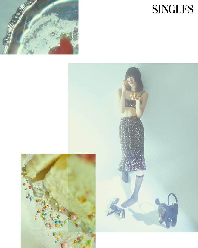 브라 톱은 가격 미정, 스커트는 2백32만원, 슬링백 힐은 2백14만원 모두 Dolce & Gabbana, 양 모양 백은 가격 미정 Moschino.