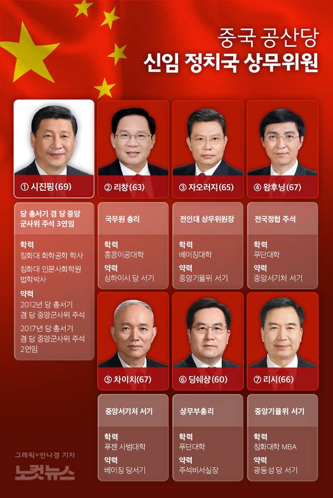 시진핑 주석은 중앙정치국 상무위원과 중앙위원회 총서기, 당중앙군사위원회 주석 등 세 개 요직을 모두 차지했다. 당초 예견됐던 일이다. 내년 3월 전국인민대표대회(전인대)에서 국가주석직도 3연임할 것이 확실시 된다.