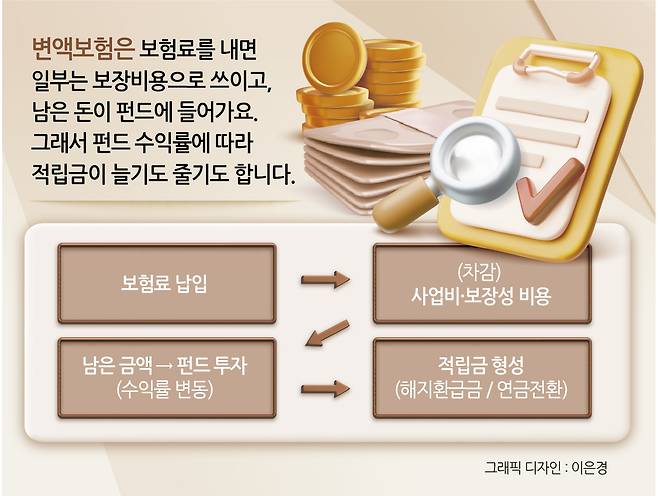변액보험은 적립식 펀드나 상장지수펀드(ETF) 등 다른 투자상품과 구조가 다릅니다. 기본이 보험이기 때문에 사망 등에 대해 먼저 보장을 해주고, 그 비용으로 위험보험료와 보증비용이 빠져나갑니다. 그리고 펀드처럼 단순히 투자수익만 보는 게 아니라, 약정된 사망보험금이나 연금액을 최소 보장해 주는 장치가 들어 있어 그 비용도 따로 듭니다.