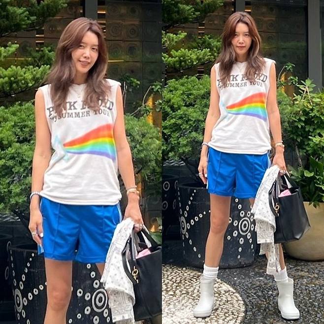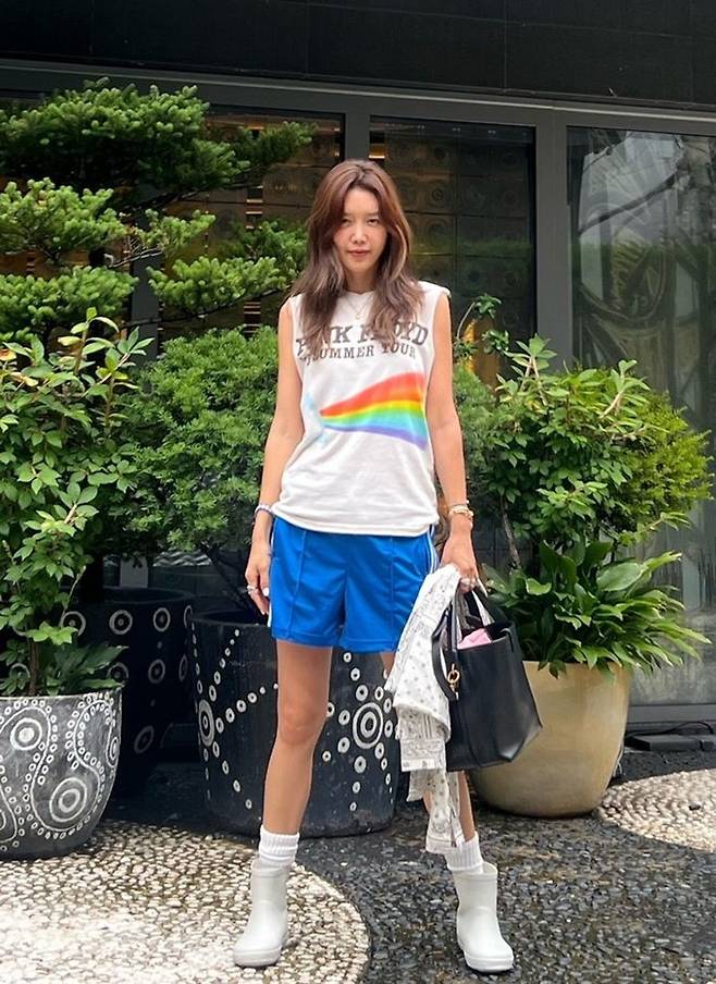 공개한 사진에서 채정안은 파란색 트랙팬츠에 민소매 티셔츠를 입고 화이트 레인부츠를 매치한 컬러풀한 레인룩으로 시원하면서도 유니크한 스타일을 완성했다.