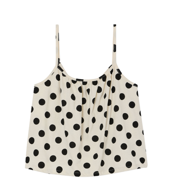 레이가 선택한 이 제품은 국내 브랜드 펀프롬펀(fun from fun)의 "[3rd] Polka Top (Ivory)"로, 폴카 도트 패턴이 인상적인 루즈핏 나시탑이다.