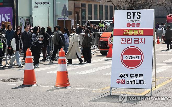 (서울=연합뉴스) 김성민 기자 = 그룹 방탄소년단(BTS)이 정규 5집 '아리랑'(ARIRANG) 발매를 기념해 무료 공연 'BTS 컴백 라이브: 아리랑'(BTS THE COMEBACK LIVE|ARIRANG)을 여는 21일 서울 광화문 광장 인근에 차량 통제 안내문이 놓여 있다. 2026.3.21