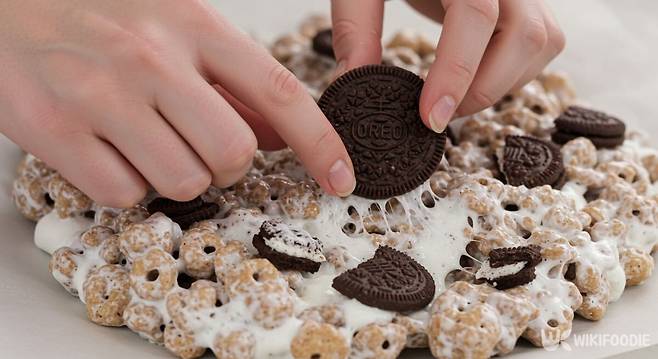 마시멜로가 고루 녹은 상태에서 시리얼이나 과자를 넣고 재빨리 섞는다. 3~4줌 정도면 적당하다. 원하는 식감에 따라 콘푸레이크, 오레오, 치토스, 감자칩, 뻥튀기 등 자유롭게 고르면 된다. 견과류를 넣으면 식감이 단단해지고, 탈지분유 2큰술을 추가하면 고소한 풍미가 더해진다. 탈지분유는 선택사항이므로 없어도 무관하다.