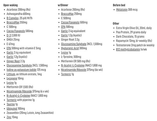 브라이언 존슨은 평소 먹는 식사에서 부족한 영양소를 보충제로 채운다. 일어나자마자 비타민B·C·D·E를 비롯해 아슈와간다, 마늘추출물, 생강뿌리, 라이코펜, 타우린, 아연, 라이신, 코코아 플라바놀 등 항산화 효과가 있는 25여 가지의 영양제를 섭취한다. 그의 보충제 목록에는 다크 초콜릿 15g과 엑스트라 버진 올리브 오일 30ml도 포함돼 있다. 잠자리에 들기 전에는 숙면을 도와주는 멜라토닌을 먹는다.