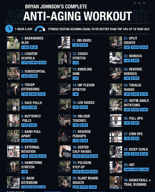 브라이언 존슨은 매일 집에 있는 헬스장에서 약 1시간 동안 ‘안티에이징’ 운동을 한다. 25여 가지로 구성된 그의 운동 루틴은 “노화 속도를 늦추고 최적의 건강 상태를 유지하기 위해” 고안됐다. 쉬는 시간 없이 햄스트링 스트레칭, 레그 레이즈, 스쿼트, 턱걸이 등 운동을 연이어 한다. 주 3회는 운동용 자전거나 로잉 머신을 이용한 고강도 운동을 실시하고 때로는 밖에서 농구, 테니스, 트레일 러닝 같은 운동을 한다.
