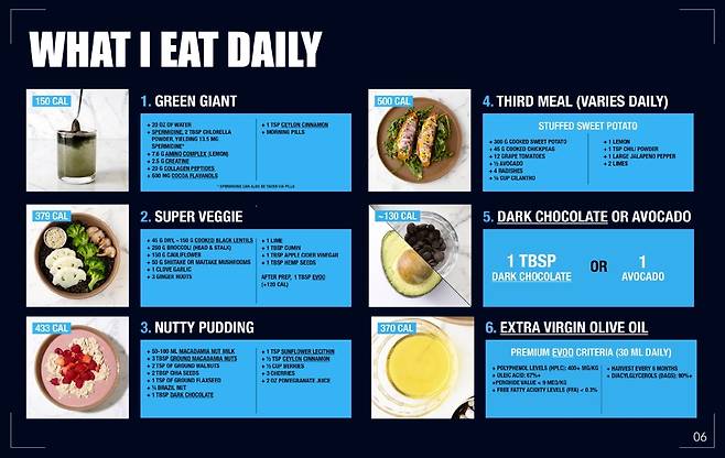 브라이언 존슨은 오전 6시에 식사를 시작해 오전 11시까지 모든 식사를 마친다. 눈을 뜨자마자 챙기는 것은 클로렐라 파우더, 콜라겐 펩타이드, 코코아 플라보넬, 실론 시나몬 등을 넣어서 만든 ‘그린 자이언트’라는 음료. 이후 브로콜리, 렌틸콩, 콜리플라워 등이 포함된 ‘슈퍼 베지’와 마카다미아 우유에 치아시드, 브라질너트, 다크초콜릿, 체리, 호두를 넣어 만든 ‘너티 푸딩’을 먹는다. 브라이언 존슨은 하루에 정확히 1977kcal를 채우는데 한 달에 30kg 이상의 야채를 섭취한다고 한다.