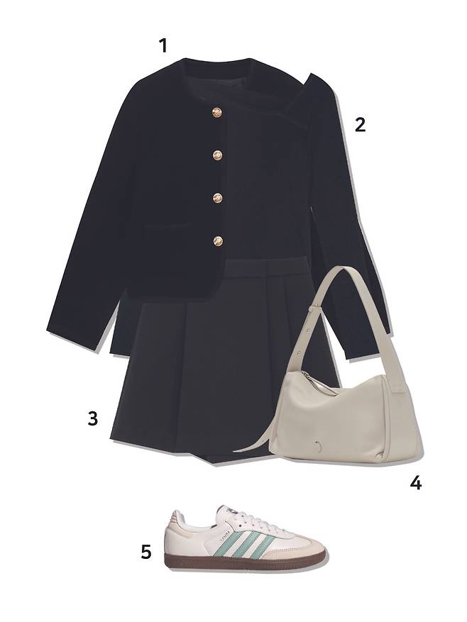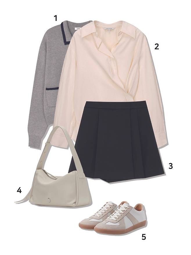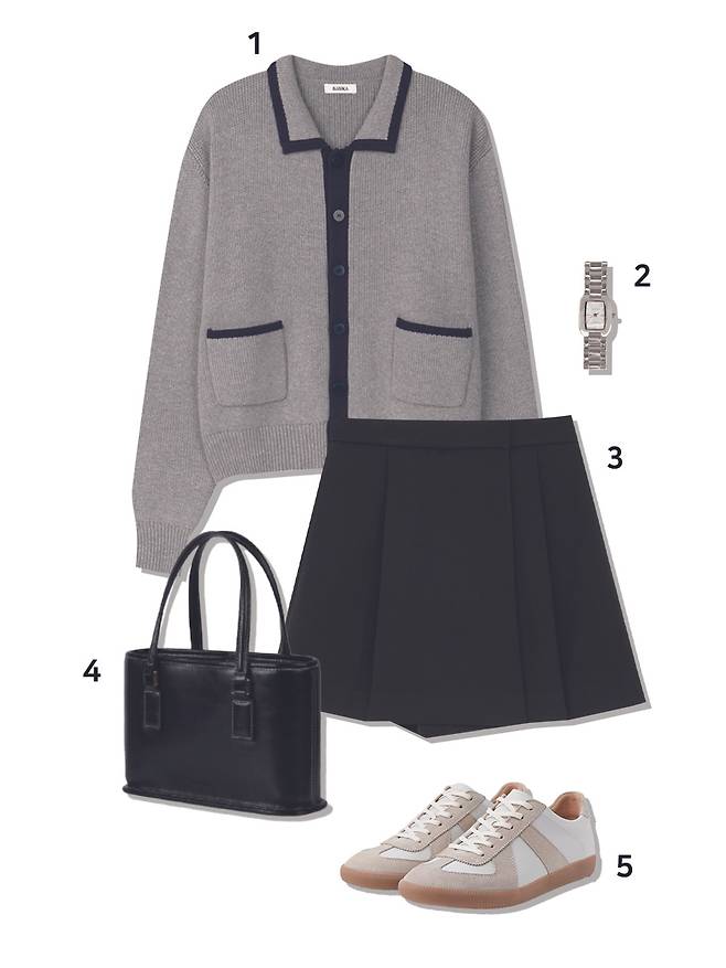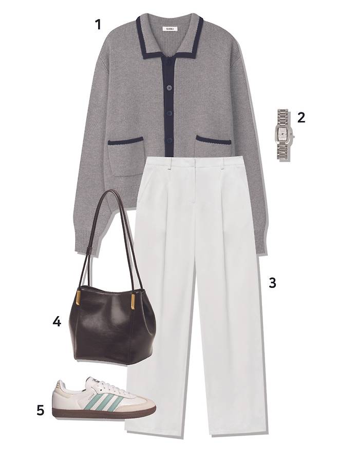1 가디건 : 바시카(109,000원) 2 시계 : 럼튼(109,000원) 3 팬츠 : 몽돌(73,000원) 4 가방 : 아뜰리에드루멘(218,000원) 5 스니커즈 : 아디다스(139,000원)
