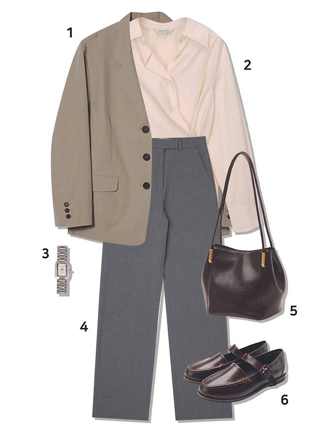 1 재킷 : 시엔느(179,000원) 2 블라우스 : 루에브르(139,000원) 3 시계 : 럼튼(109,000원) 4 슬랙스 : 시야쥬(89,000원) 5 가방 : 아뜰리에드루멘(218,000원) 6 로퍼 : 스티유(89,000원)