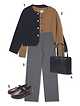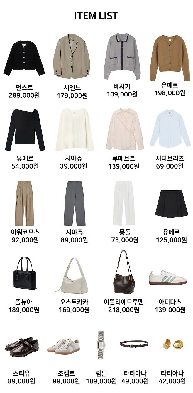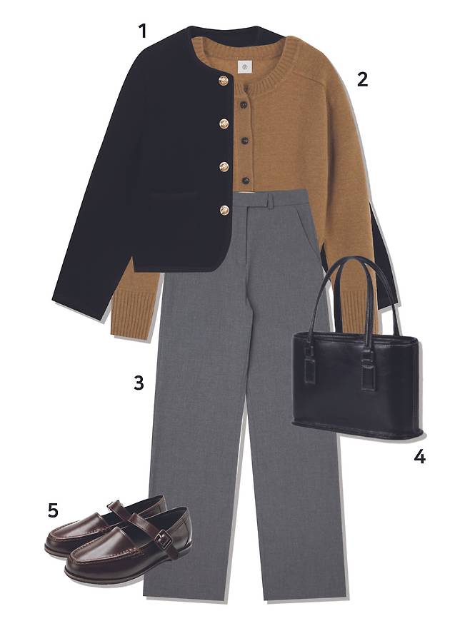 1 아우터 : 던스트(289,000원) 2 가디건 : 유메르(198,000원) 3 슬랙스 : 시야쥬(89,000원) 4 가방 : 폴뉴아(189,000원) 5 로퍼 : 스티유(89,000원)