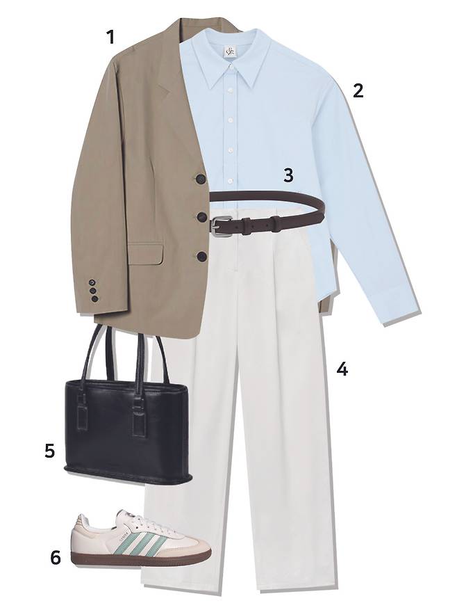 1 재킷 : 시엔느(179,000원) 2 셔츠 : 시티브리즈(69,000원) 3 벨트 : 타티아나(49,000원) 4 팬츠 : 몽돌(73,000원) 5 가방 : 폴뉴아(189,000원) 6 스니커즈 : 아디다스(139,000원)