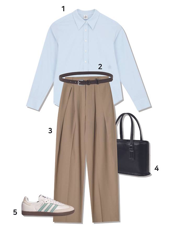1 셔츠 : 시티브리즈(69,000원) 2 벨트 : 타티아나(49,000원) 3 슬랙스 : 아워코모스(92,000원) 4 가방 : 폴뉴아(189,000원) 5 스니커즈 : 아디다스(139,000원)