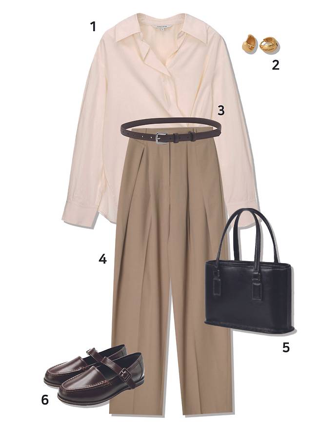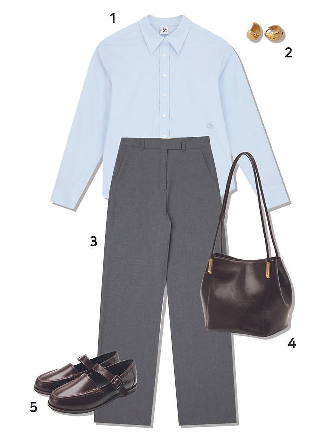 1 셔츠 : 시티브리즈(69,000원) 2 귀걸이 : 타티아나(42,000원) 3 슬랙스 : 시야쥬(89,000원) 4 가방 : 아뜰리에드루멘(218,000원) 5 로퍼 : 스티유(89,000원)