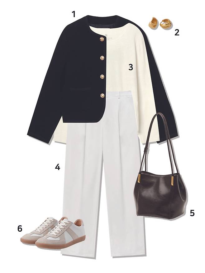 1 가디건 : 유메르(198,000원) 2 귀걸이 : 타티아나(42,000원) 3 팬츠 : 유메르(125,000원) 4 가방 : 아뜰리에드루멘(218,000원) 5 슈즈 : 조셉트(99,000원)