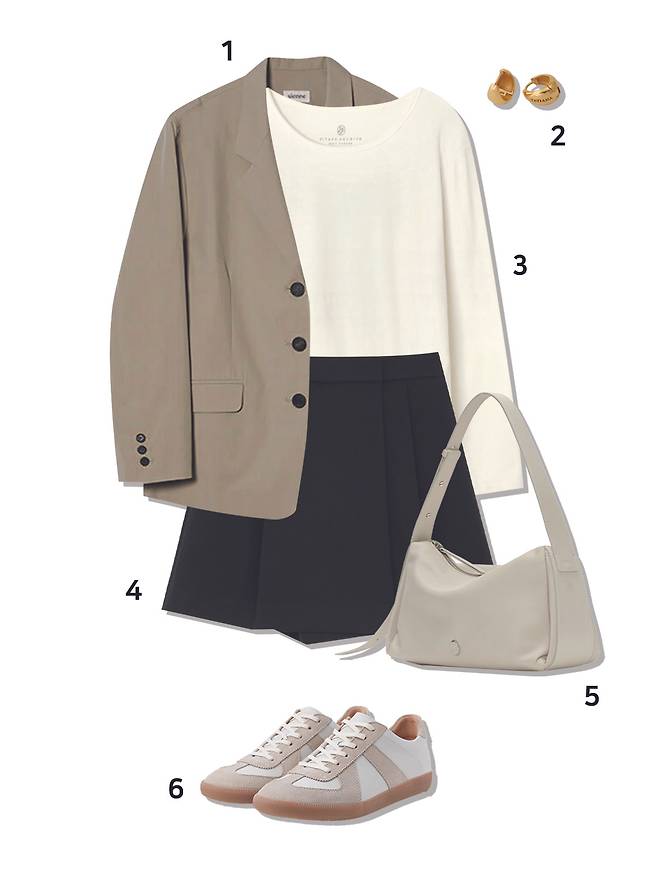 1 아우터 : 던스트(289,000원) 2 귀걸이 : 타티아나(42,000원) 3 티셔츠 : 시야쥬(39,000원) 4 팬츠 : 몽돌(73,000원) 5 가방 : 아뜰리에드루멘(218,000원) 6 슈즈 : 조셉트(99,000원)