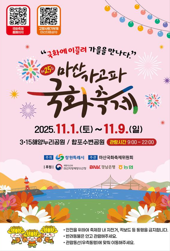 마산가고파국화축제는 바다·꽃·빛이 함께 만들어내는 감성형 가을 축제입니다. 단순히 국화를 전시하는 행사가 아니라 볼거리·먹거리·즐길 거리가 균형 있게 갖춰진 체류형 축제로 성장했습니다. 가을 감성 충전, 인생 사진 남기기, 가족 힐링 나들이를 한 번에 해결하고 싶다면 올해 11월, 마산 바다 옆 국화 세상으로 떠나보세요.