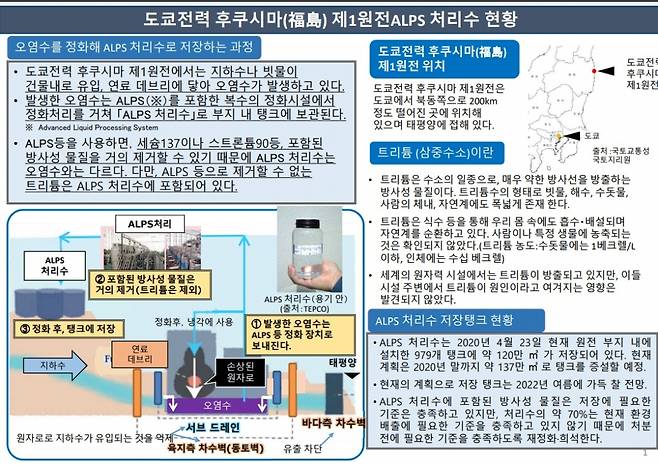 현재도 방사성 물질이 담긴 물이 후쿠시마 원전 건물 안에서 생성되고 있다. 하지만 일본 측은 다핵종제거설비(ALPS)를 통한 오염수 정화등 '후쿠시마 정화'에 자신감을 드러내 왔다. 방사성 물질 가운데 하나인 트리튬(삼중수소)이 ALPS에서 걸러지지 않고 있는 것에 대해 주한국일본대사관은 "트리튬은 매우 약한 방사선을 방출하는 방사성 물질"이라며 "빗물, 해수, 수돗물, 사람의 체내, 자연계에도 폭넓게 존재한다"고 설명하고 있다. 반면 이재명 더불어민주당 대표가 15일 일본의 오염수 해양 방류 계획을 겨냥, "안전하면 식수로 사용하라"고 주장하는 등 야권 중심으로 일본의 오염수 해양방류 관련 반발이 이어지고 있다. 한국 시찰단의 행보에 귀추가 주목되는 이유다.