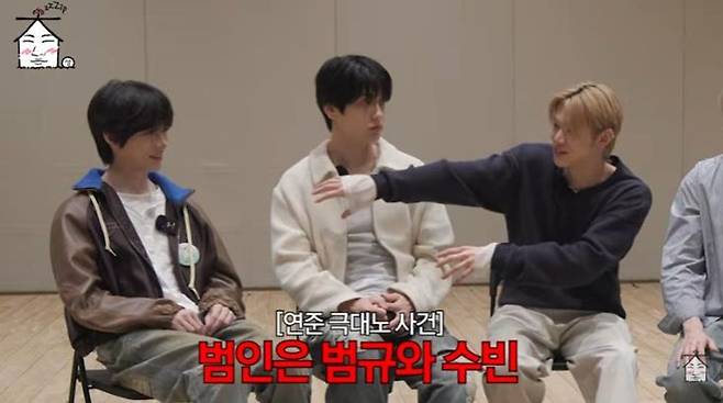 범규는 "연준 형이 그렇게 쌓인 게 있는 줄 몰랐다"고 해맑게 말했고, 수빈도 "여러모로 스트레스 받는 건 알았지만 저희한테 그렇게 터뜨릴 줄은 몰랐다"고 털어놨다. 이에 연준은 "너희 때문에 스트레스를 받고 있던 것"이라며 "둘은 기억이 안 나는 것 같다"고 반박했다. 그러자 범규는 "저는 안 좋은 기억은 빨리 잊는다"고 답해 또 한 번 폭소를 자아냈다.