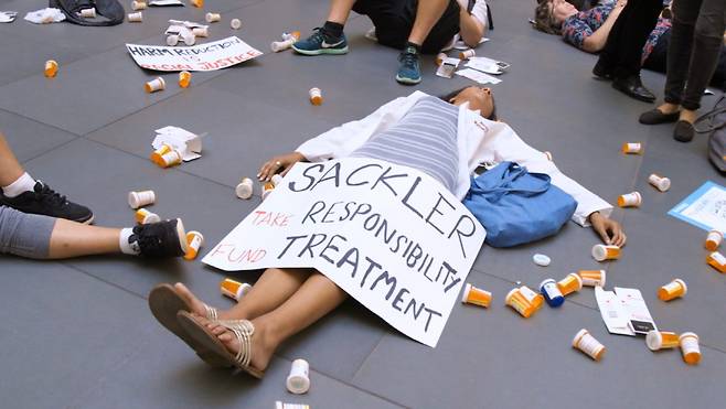 여생을 편하게 전시하며 살 수 있었던 아티스트가 갑자기 시위대의 주체가 된 이유는 무엇일까? 2014년 손목 수술 후 처방전대로 옥시콘틴(오피오이드 계열 마약성 진통제)을 먹었는데 하루 만에 약물에 중독되어 3년동안 힘든 시간을 견뎠다. 자세히 따져 보니 복용한 약을 만든 제약회사 ‘퍼듀 파마’의 꼭대기에는 ‘새클러 가(家)’가 있었고 미국 내에 마약성 진통제가 어떤 과정으로 퍼져 있는지 알게 된다.