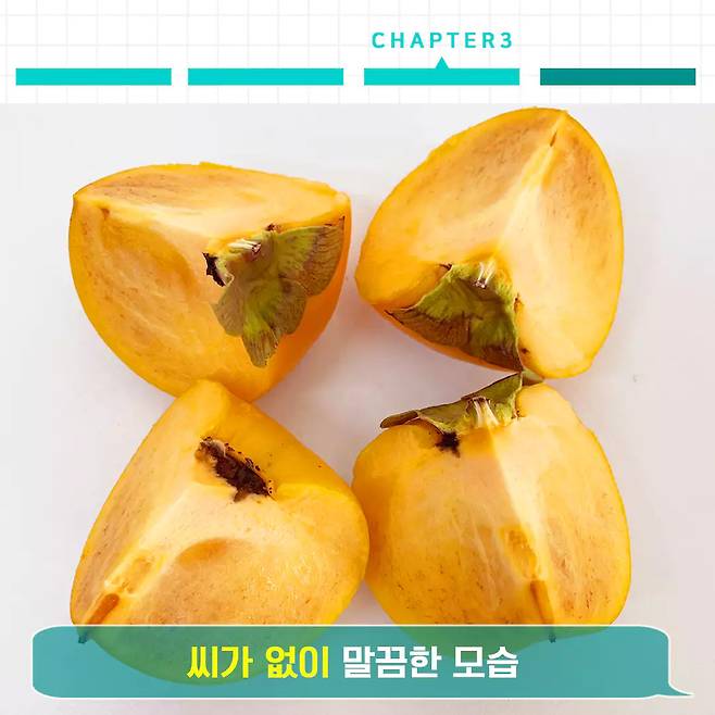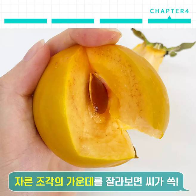그래서 발견한 꿀팁이 있습니다. 씨만 쏙쏙 피해 단감 예쁘게 자르는 꿀팁, 보여드릴게요. 스타트~