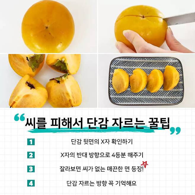 정리정리! “단감을 자를 때는 X자와 반대로”만 기억하세요. 소소하지만 유용한 꿀팁이 되었길 바라며 저는 다음에 더 좋은 꿀팁으로 찾아올게요. 안녕~