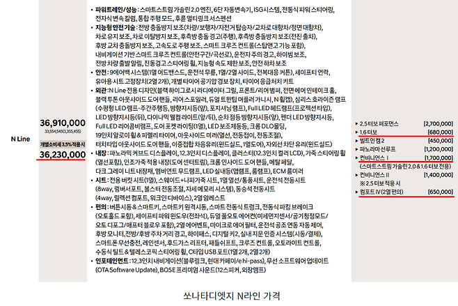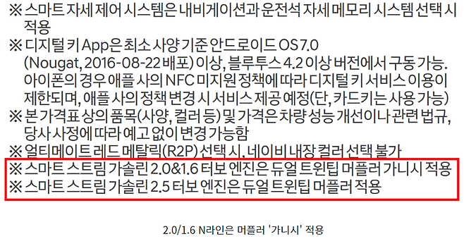 참고로 가솔린 모델의 경우 가격표를 보실 때 주의사항이 있습니다. N라인을 포함한 모든 가솔린 등급에서는 '2.0 가솔린' 엔진이 기본이고 선택옵션으로 68만원을 추가해야 '1.6 가솔린 터보 엔진'이 들어가니 항상 가격표를 볼 때 68만원이 깔려 있다고 보셔야 합니다.