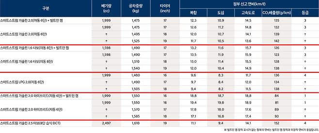 그리고 글을 작성하고 있는 5월 2일 기준으로는 하이브리드 모델의 경우 친환경 자동차 인증 및 고시 확정 이전이므로 가격표가 공개되지 않은 상태입니다. 따라서 오늘은 하이브리드를 제외한 가솔린과 LPG 모델에 한정하여 업로드 하도록 하겠습니다.