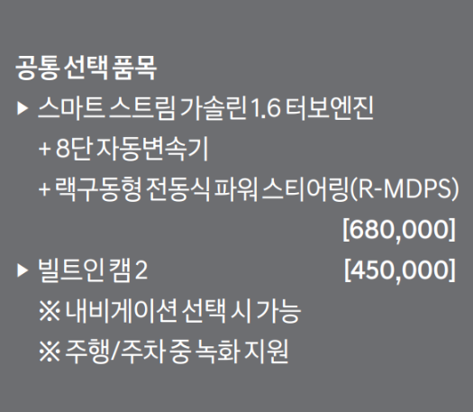 일단 전반적으로 쓸만한 구성이지만 몇 가지 분명히 알고 계셔야 하는 것들이 있습니다. 아무런 선택옵션을 넣지 않는다면 선택할 수 없는 대표적인 것들이 있는데 통풍시트, 스마트크루즈 컨트롤, 2열 암레스트 그리고 하이패스도 안들어갑니다. 그래도 좋은 점도 많습니다. 후방카메라, 오토홀드, LED헤드램프, 전후방 주차센서 등이 모두 기본으로 들어가 있습니다.