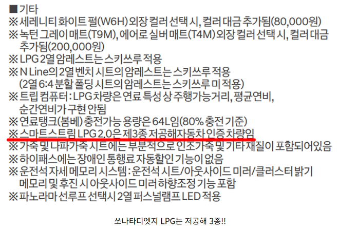 그렇다면 이번에 LPG는 무조건 별로냐? 그것도 아닙니다. 2.0 가솔린이 가지지 못하는 장점도 있습니다. 바로 LPG 모델은 3종 저공해 인증을 받았기 때문입니다. 이 인증을 받으면 인천공항을 포함한 공영주차장 50% 할인등의 혜택을 받을 수 있으니 주차 환경에 도움이 되는 분들에게는 쉽게 포기치 못할 그런 혜택인 것이죠.