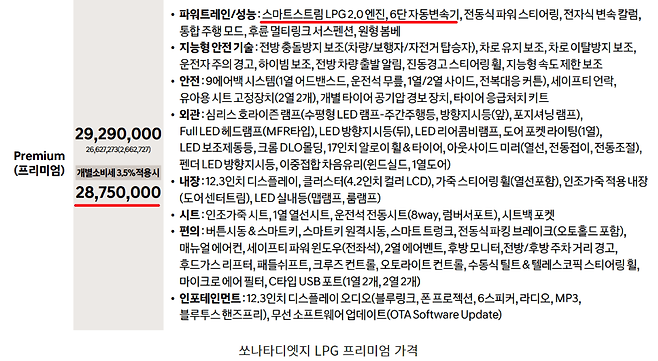 2,787만원에 68만원을 더해 2,855만원이 되는데 여기에 25만원짜리 하이패스+ECM룸미러를 넣어도 아무것도 넣지 않은 LPG 기본 모델보다 겨우 5만원 더 비싼겁니다. 아셨죠?