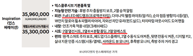 물론 N라인은 좀 다른 구성이긴 합니다. '달리라고 만들어 놓은 모델'이니 시트도 버킷 시트가 들어가 있긴 하지만 실제로 그냥 모양이 예뻐서 도심용으로 구입하시는 경우가 더 많기 때문에 인스퍼레이션과 옵션을 기준으로 동일하게 구성하면 무려 3,926만원입니다. 인스퍼레이션과 223만원 차이가 나는군요.
