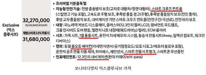 이 등급에서 반가운 것들을 좀 나열해보면 스마트 크루즈 컨트롤, 1열 통풍시트, 오토에어컨, 전동식 트렁크가 있습니다. 12.3인치 내비가 들어가는 것은 좋지만 어차피 프리미엄에서도 폰프로젝션이 가능한 12.3인치 디스플레이 오디오가 들어가니 뭐 그리 반길 정도는 못됩니다.
